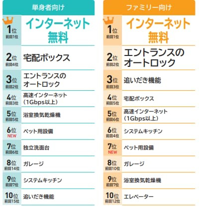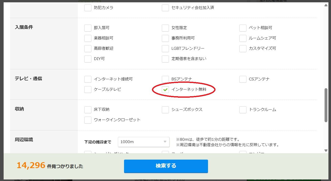 1位は単身者向け・ファミリー向け共に「インターネット無料」でした。なんと単身者向けでは10年連続、ファミリー向けでは9年連続1位を獲得しております。今や町のあらゆる場所に導入されており、設置されてて当たり前の時代になってきております。特に20代、30代の方はお部屋探しの必須条件としている方が増えているのを実感しております。下記写真のように、条件検索の段階で希望設備にチェックを入れますので、インターネット無料設備が導入されていなければ、検索結果に物件が表示されない為、お客様の目に留まることもありません。