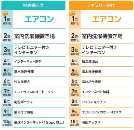 第1位は、単身者・ファミリー共に【エアコン】でした。特に単身者の場合は、必ずと言っていいほどお部屋探しの際の絶対条件となっております。最新のエアコンはお掃除機能など機能が充実したものもありますが、できる限りシンプルな機能のエアコンを設置することをお勧めします。理由は、シンプルな機能なものほどメンテナンスがし易く、洗浄費用なども安く済みます。あと3位にランクインしたテレビモニター付きインターホンもかなり需要が高いと言えます。昔ながらの受話器のみのタイプの場合、かなり選ばれにくい物件となってしまいます。エアコンと比べ金額も安価ですので、退去のタイミングなどで導入することをお勧めします。